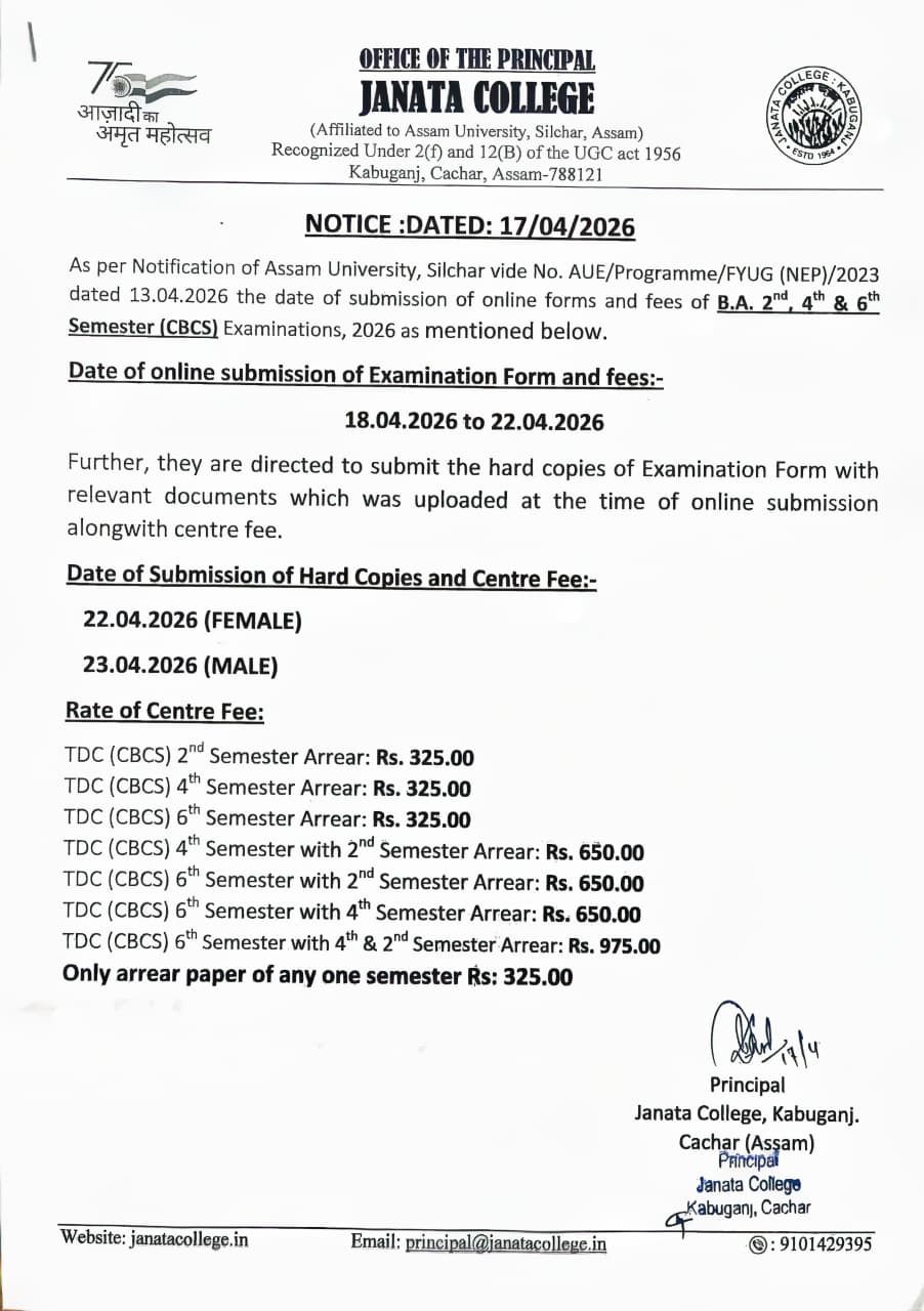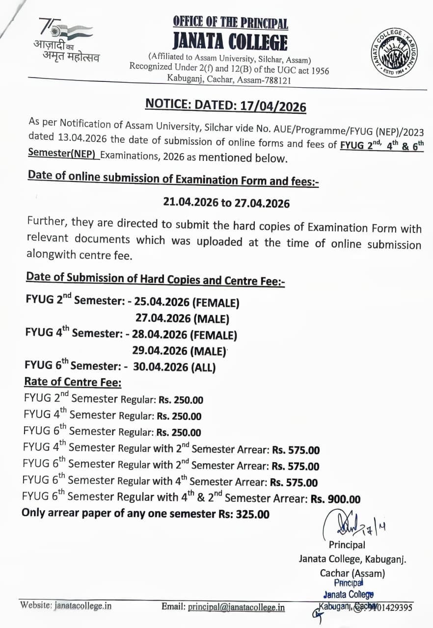 Janata College, established in 1964 by a galaxy of dedicated nationalists, philanthropists and academics, with a pious vision to disseminate higher education in the remote parts of the Barak Valley. The college is situated at Kabuganj at a distance of 20 Km to the South-East of Silchar.